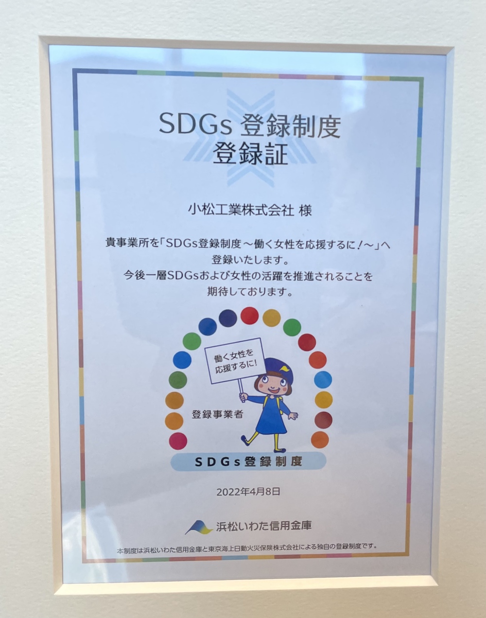 弊社小松工業株式会社はSDGsへの取り組みを評価され、浜松いわた信用金庫様よりSDGs登録事業者として認定を頂きました。