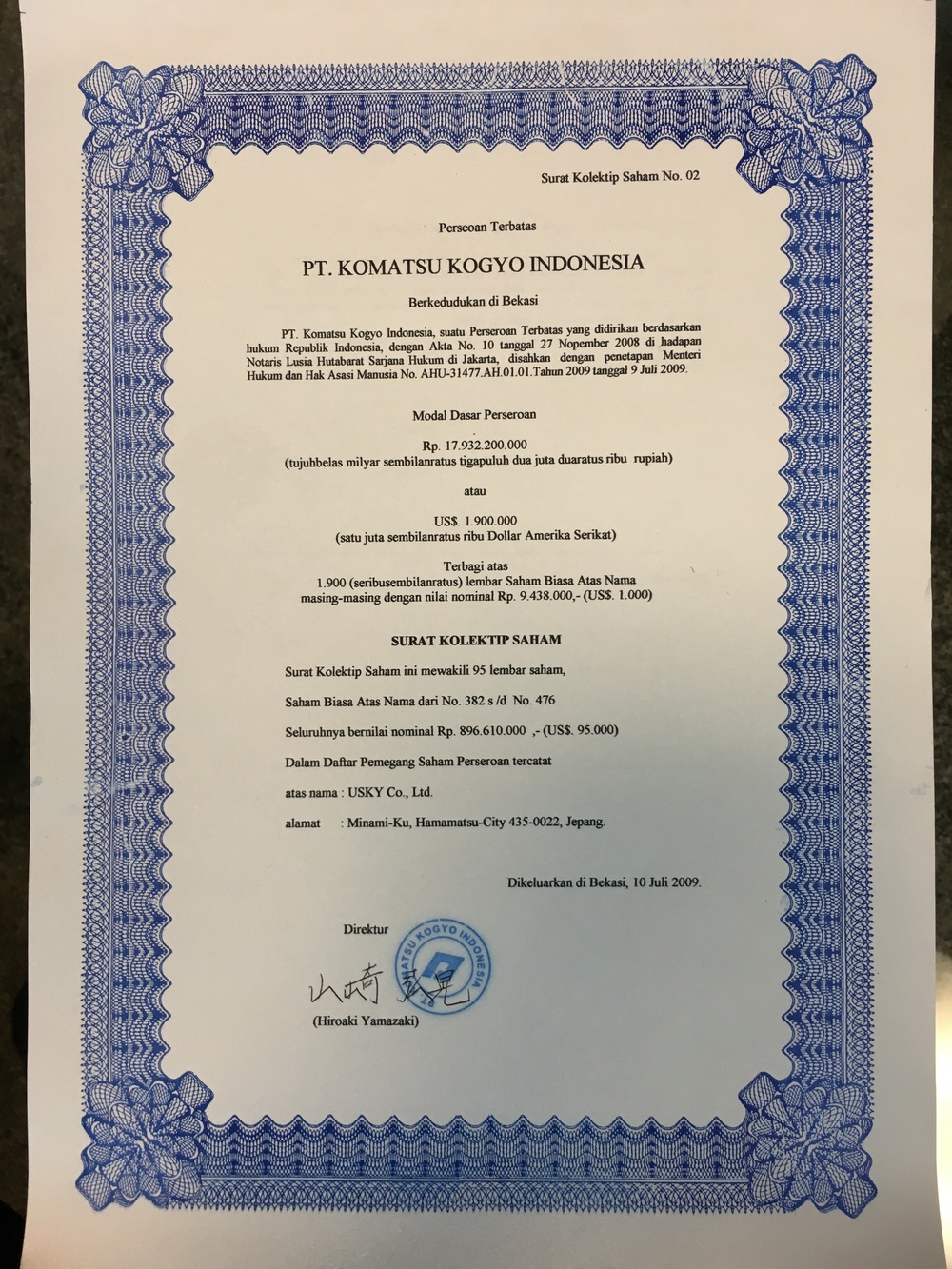 PT.KOMATSU KOGYO INDONESIA(以下KKI)の株式95株(約2%)を㈱アスキー様より取得