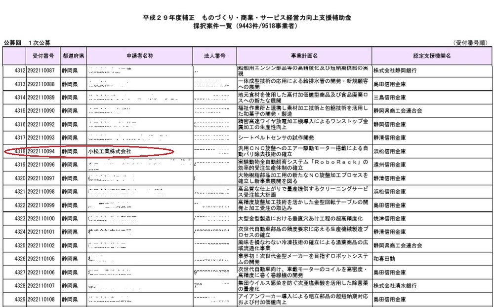 2017年度補正予算補正「ものづくり・商業・サービス経営力向上支援補助金」(通称:物造り補助金)の結果が公開され当社も採択されました