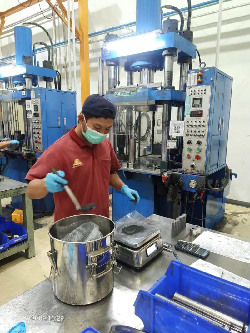 Bubuk ditimbang secara akurat, dituangkan ke dalam silinder dan ditekan.